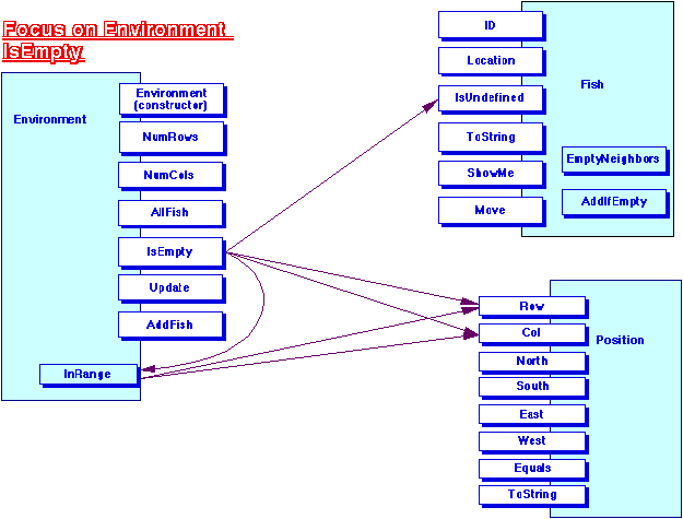 Running the Simulation | Simulation::Step | Fish::Move | Fish::EmptyNeighbors | Environment::IsEmpty | Environment::Update | Display::Show