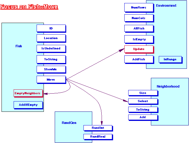 Click to see header file for Fish class Click to see header file for Fish class Click to see header file for Fish class Click to see diagram for Fish::EmptyNeighbors Click to see header file for Environment class Click to see diagram for Environment::Update Click to see header file for Neighborhood class Click to see header file for RandGen class